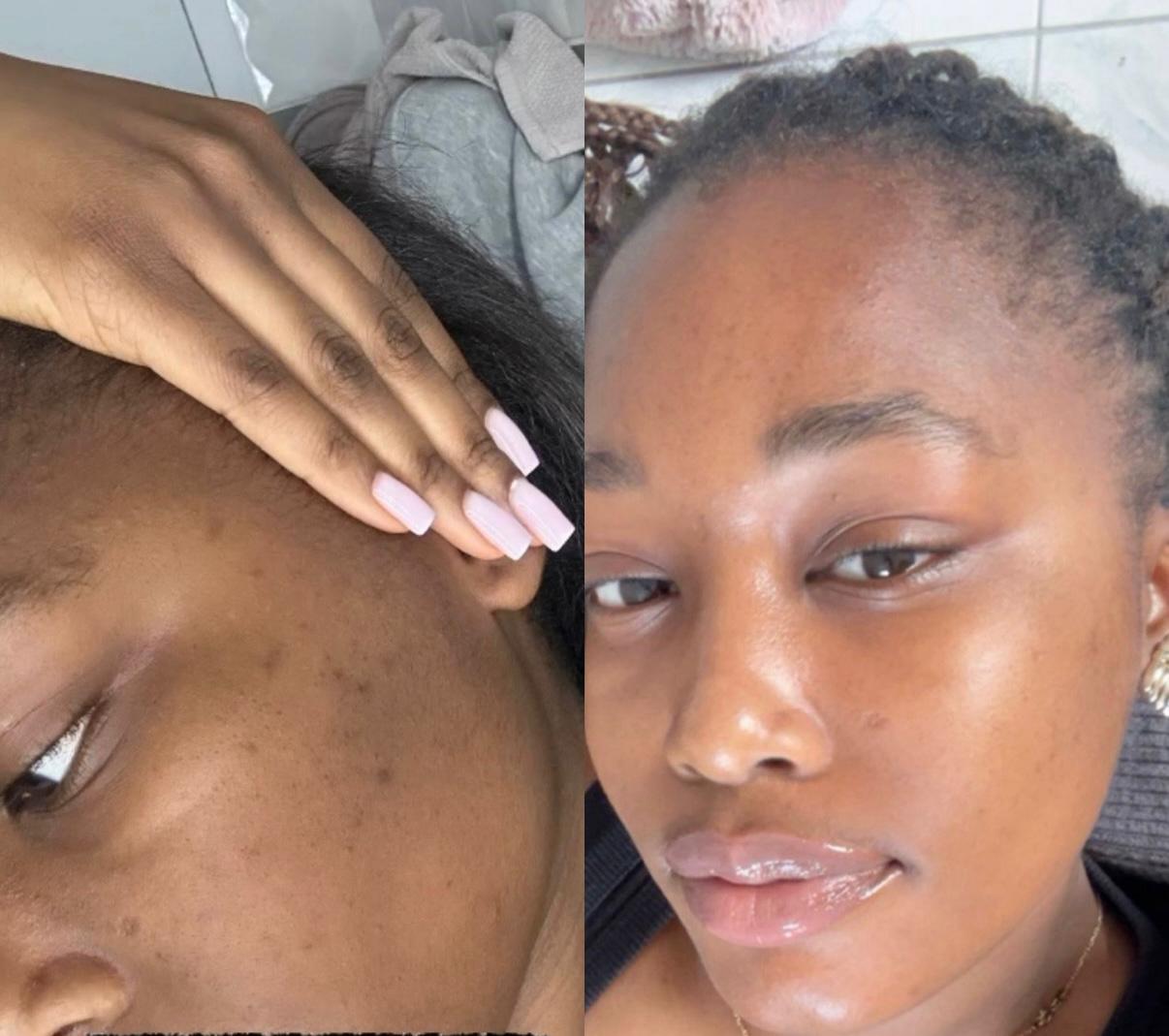 “(Il n'y a aucun filtre) Vraiment ma peau elle a prit tellement d'éclat !!!!!! Les taches s'estompent petit à petit, je pense que d'ici 1-2 mois c'est bouclé et je suis hyper satisfaite parce que les produits durent. Cela fait 1 mois matin et soir que j'utilise le nettoyant et je suis même pas au 1/3 du flacon.”